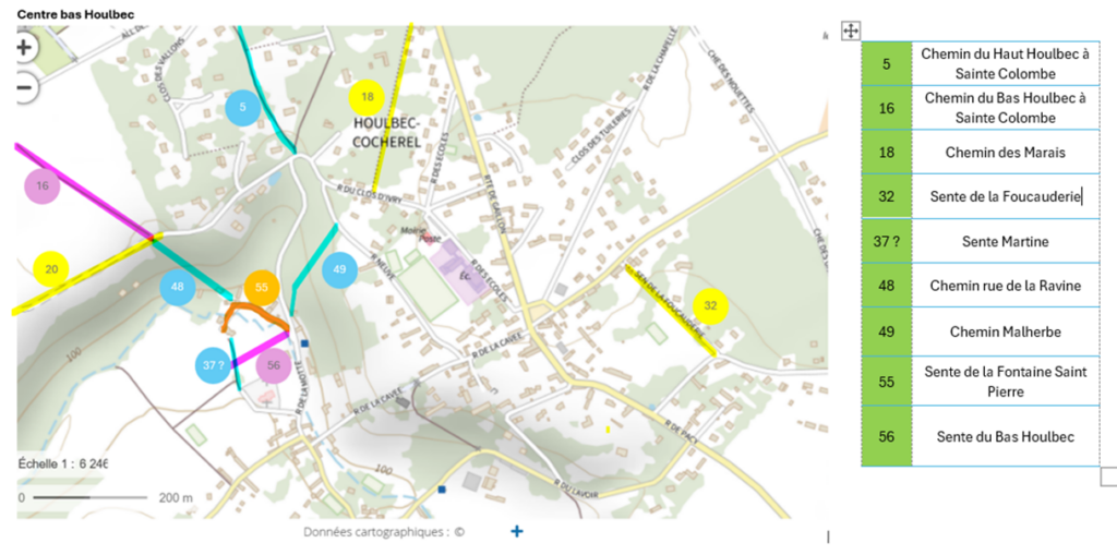 Cette première carte zoome sur sa gauche sur les petits chemins du bas Houlbec, autour de l’Eglise : combien en connaissez-vous ? D’autres cartes à venir prochainement !